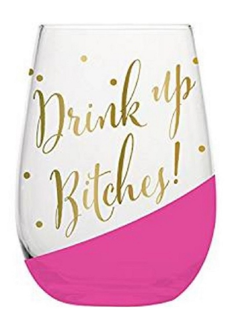 Loading... Please wait...Drink Up Bitches Large Pink and Gold 20 oz. Stemless Wine Glass