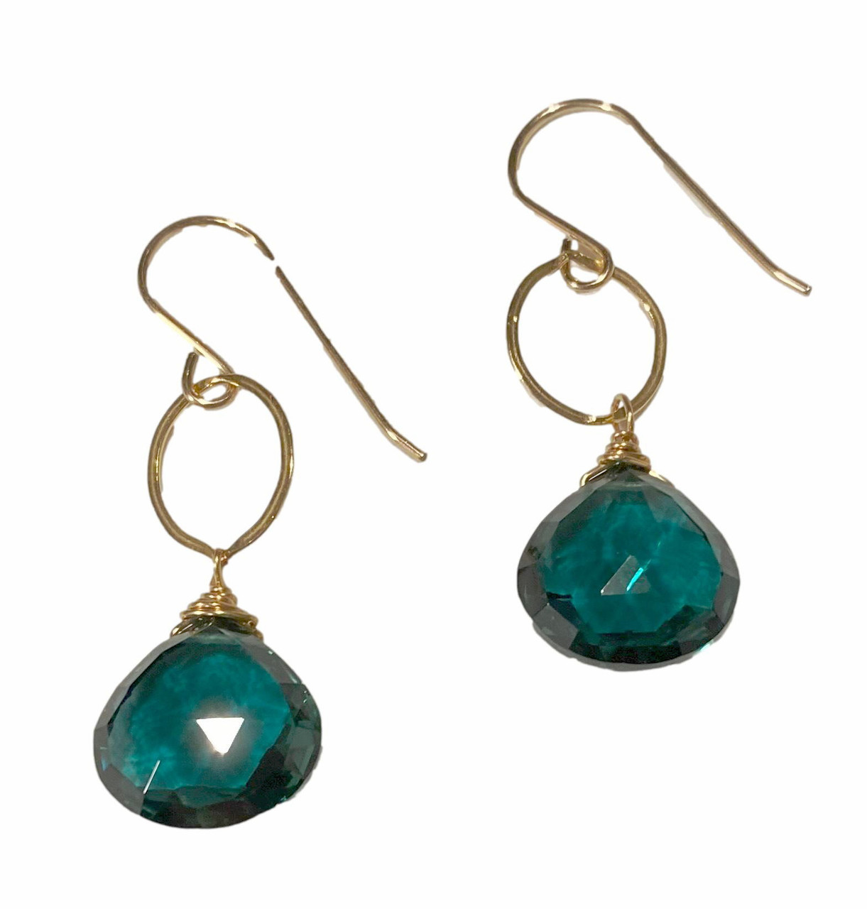 12 MM Indicolite Quartz and Gold Teardrop Dangle Earrings by Judy Brandon